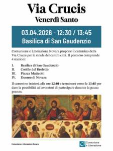 Novara - In occasione del Venerdì Santo, Comunione e Liberazione Novara propone una Via Crucis per le strade del centro cittadino, momento di preghiera e riflessione aperto a tutti, in un orario congeniale a tutti coloro che si trovino in città nell’orario di pranzo. L’appuntamento è fissato per venerdì 3 aprile 2026, con ritrovo presso la Basilica di San Gaudenzio. Il cammino prenderà avvio alle ore 12.40 e si concluderà in Duomo intorno alle 13.45, così da consentire la partecipazione anche a chi desidera vivere questo momento durante la pausa pranzo.