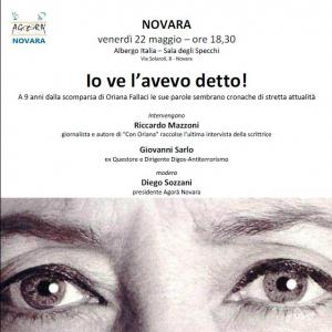 Novara - Novara, a nove anni di distanza dalla scomparsa, ricorda la grande giornalista e scrittrice Oriana Fallaci in un incontro organizzato all'Albergo Italia in via Solaroli in programma venerdì 22 maggio alle 18.30. Intervengono Roberto Mazzoni, giornalista e autore del libro 'Con Oriana' che raccoglie gli ultimi scritti e interviste dell'inviato del Corriere della Sera, quindi ci sarà anche l'ex Questore di Novara e dirigente Digos e anti-terrorismo Giovanni Sarlo. Modera il presidente dell'associazione Agorà Diego Sozzani (consigliere regionale Forza Italia). L'ingresso è libero. Tema dell'incontro: "Io ve l'avevo detto!", una frase della Fallaci che a nove anni dalla scomparsa sembra essere di stretta attualità soprattutto oggi.