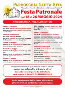 Domenica 26 maggio sarà interamente dedicata ai bambini e ai ragazzi: alle 11,15 sarà celebrata la Messa di chiusura del catechismo. Alle 15 gli animatori hanno preparato la “Caccia al tesoro… alla scoperta del nostro quartiere” e alle 17,30 Mister Richard farà divertire e stupire i presenti con il suo spettacolo “Fantasilandia”. Dalle 19,30 spazio ancora per la musica con “Canta tu… santaritesi e no allo sbaraglio” con “Malù DJ” e per la premiazione del “Trofeo Santa Rita”.