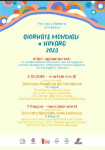 Novara - Presso la Fondazione Faraggiana in via Bescapè 12 a Novara si terranno il giorno 6 e 7 giugno gli ultimi due appuntamenti pre-estivi della serie delle Giornate Mondiali a Novara organizzate da Pro Loco Novara. Come si può vedere dalla bella locandina realizzata dalla brava artista Kateryna Veshtak (da anni novarese d'adozione) i due eventi sono dedicati all'Ambiente e alla Lentezza.