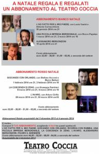 Nel dettaglio: l’abbonamento Bianco Natale comprende gli spettacoli L’ho fatto per il mio paese con Lucia Vasini e Antonio Cornacchione (30 gennaio 2014 ore 21), Una piccola impresa meridionale con Rocco Papaleo (1 marzo 2014 ore 21 o 2 marzo 2014 ore 16) e il nuovo spettacolo di Alessandro Bergonzoni (16 aprile 2014 ore 21); l’abbonamento Rosso Natale invece comprende Giocando con Orlando con Stefano Accorsi e Marco Baliani (1 febbraio 2014 ore 21 o 2 febbraio 2014 ore 16), La coscienza di Zeno con Giuseppe Pambieri (8 marzo 2014 ore 21 o 9 marzo 2014 ore 16), L’avaro con Arturo Cirillo (29 marzo 2014 ore 21 o 30 marzo 2014 ore 16). Il costo di ciascun abbonamento è di euro 33, 39, 51, 63 a seconda del settore del teatro prescelto. E’ possibile acquistare gli abbonamenti di Natale fino a sabato 4 gennaio 2014. Per chi desidera spaziare tra tanti generi diversi è possibile acquistare, sempre a partire da martedì 3 dicembre, il Tuo abbonamento. Si potrà infatti scegliere 4 titoli tra gli spettacolo L’ho fatto per il mio paese, Giocando con Orlando, Ricorda con rabbia con Stefania Rocca (22 febbraio 2014 ore 21 o 23 febbraio 2014 ore 16), Una piccola impresa meridionale, La coscienza di Zeno, L’avaro, Alessandro Bergonzoni, Figaro il barbiere con Elio delle Storie Tese (10 maggio 2014 ore 21 o 11 maggio 2014 ore 16) e creare il proprio personale abbonamento, il cui costo è di euro 44,52,68,84aseconda del settore del teatro prescelto. L’abbonamento è acquistabile fino al giorno in cui viene messo in scena il primo degli spettacoli scelti. Sempre in clima di festività natalizie, sarà Aggiungi un posto a tavola lo spettacolo in programma per la notte di San Silvestro. La acclamatissima commedia musicale di Garinei e Giovannini con le musiche di Armando Trovajoli sarà messa in scena dalla Compagnia dell’Alba martedì 31 dicembre a partire dalle 22.30 per accompagnare il pubblico al brindisi di mezzanotte e all’arrivo del nuovo anno.