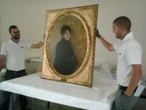 Novara - Operazioni di consegna e trasporto oggi, venerdì 12 settembre, del quadro di Giovanni Segantini "Ritratto di giovane signora (ritratto di donna malata), un olio su tela datato 1800, cm 105x80, appartenente alla Collezione Giannoni, che verrà esposto alla mostra "Giovanni Segantini. Il ritorno a Milano" che si terrà a Milano, a Palazzo Reale dal 18 settembre 2014 al 18 gennaio 2015.