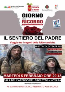 Novara - Un appuntamento organizzato dalla Provincia, in particolare dal delegato Ivan De Grandis, per ricordare i tanti martiri delle foibe, uccisi o costretti all'esilio in occasione dei 'rastrellamenti' da parte delle truppe titine nei confronti degli italiani al termine della Seconda Guerra Mondiale. In occasione del Giorno del Ricordo martedì 5 febbraio alle 20.45 presso l'arengo del Broletto (via F.lli Rosselli) si tiene 'Il sentiero del padre', viaggio tra i segreti delle foibe carsiche, di e con Davide Giandrini, regia di Franco Palmieri.