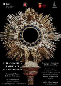 Novara - La Delegazione FAI di Novara invita cittadini e appassionati d’arte e tradizione all’evento “Visita al tesoro della Basilica di San Gaudenzio”, un momento unico per scoprire i tesori nascosti della Basilica del Santo Patrono della città di Novara. L’appuntamento è fissato presso la Basilica domenica 1° marzo alle ore 15. Le visite, organizzate su turni, permetteranno di ammirare i preziosi oggetti di inestimabile valore, strettamente legati alla tradizione di San Gaudenzio, custoditi all’interno della Basilica. Un percorso che offrirà al pubblico l’opportunità di conoscere la storia, il valore artistico e il significato spirituale di questi manufatti unici, vivendo un’esperienza immersiva nel patrimonio storico, culturale e artistico di Novara, accompagnati dalla passione e dalla competenza dei volontari FAI.
