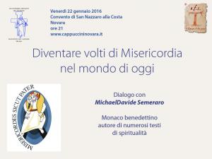 Novara - Nella serata di venerdì 22 gennaio, solennità di san Gaudenzio, nel convento di San Nazzaro a Novara alle 21, ci sarà una serata dal titolo: “Diventare volti di misericordia nel mondo di oggi” con fratel MichaelDavide Semeraro. Un dialogo per entrare appieno nell’anno giubilare voluto da papa Francesco, attraverso la straordinaria sensibilità di fratel MichaelDavide. MichaelDavide Semeraro, monaco benedettino dal 1983, vive nella Koinonia de la Visitation a Rhêmes Notre-Dame in Valle d’Aosta. Dopo i primi anni di formazione monastica, ha conseguito il dottorato in Teologia Spirituale presso l’Università Gregoriana di Roma. Coniugando la sua esperienza monastica con l’ascolto delle tematiche che turbano e appassionano il cuore degli uomini e delle donne del nostro tempo, offre grandi contributi alla riflessione spirituale dei laici. Autore di numerose pubblicazioni di spiritualità, teologia biblica e riflessione spirituale.