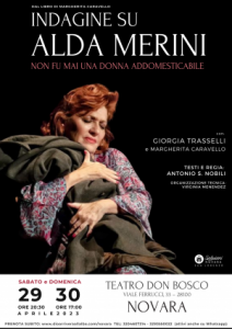Novara - Appuntamento al Teatro Don Bosco a Novara in viale Ferrucci 33 sabato 29 alle ore 20.30 e domenica 30 aprile alle ore 17 con 'Indagine su Alda Merini', una poetessa che non fu mai una donna addomesticabile. In scena Margherita Caravello e la straordinaria Giorgia Trasselli a dar corpo e voce alla poetessa dei Navigli, con la sua la passione indomita e la tue tempra ironica e generosa. E poi ci sarà lei, Alda Merini in una serie di proiezioni video anche inedite per raccontare in un coro a tre voci al femminile le più diverse sfumature della verità di una donna, che si sa: non è mai una sola.