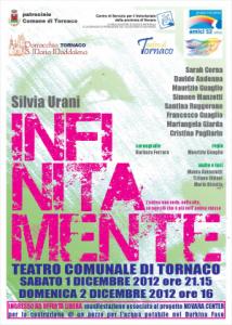 Domenica 2 dicembre alle ore 16 il Teatro Comunale di Tornaco ospita "Infinitamente"; è uno spettacolo musicale ideato e diretto da Maurizio Guaglio, raccogliendo i desideri e la sensibilità di Silvia, “Infinitamente” si muove leggero, talvolta vibrante, come l’animo umano. Il Gruppo Trecatese Amici 52 nel proporre lo spettacolo, promuove la raccolta fondi per il progetto "Acqua con Acqua" allo scopo di costruire un pozzo di acqua potabile in Burkina Faso in collaborazione con l'Associazione Novara Center. L'ingresso è libero e a invito.
