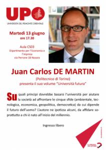 Novara - «Su quali principi dovrebbe basarsi l’università per aiutare la società ad affrontare le cinque sfide (ambientale, tecnologica, economica, geopolitica, democratica) da cui dipende il futuro dell’uomo?» Se lo chiede nel suo libro Università futura, tra democrazia e bit (Codice edizioni, scheda libro), il professor Juan Carlos De Martin, docente presso il Dipartimento di Automatica e Informatica del Politecnico di Torino, che il prossimo 13 giugno sarà ospite presso il Campus Universitario "Perrone" (ore 17.30, aula CS03) di un evento organizzato da UPO e Circolo dei Lettori di Novara.