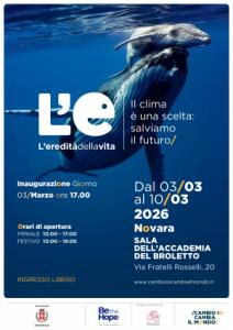 Novara - Arriva a Novara dal 3 al 10 marzo la mostra “L’eredità della vita. Il clima è una scelta: salviamo il futuro”, realizzata nell’ambito del progetto “Cambio io, cambia il mondo: pensare globalmente, cambiare interiormente, agire localmente”. Il progetto è promosso e coordinato dalla Fondazione Be The Hope e finanziato con i fondi dell'8x1000 dell'Istituto Buddista Italiano Soka Gakkai. L’evento, con il patrocinio del Comune di Novara, è dedicato alla crisi climatica e alle azioni che ognuno può fare per affrontarla con speranza e ottimismo. L’inaugurazione si svolge alle ore 17.00 di martedì 3 marzo 2026 nella Sala dell’Accademia del Broletto, in via F.lli Rosselli 20, a Novara. L’ingresso è libero.