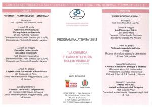 "La Chimica è l'Architettura dell'Invisibile" è infatti l'insegna sotto la quale, tra aprile e novembre 2013, si terranno 2 cicli di incontri di quattro appuntamenti ciascuno.
