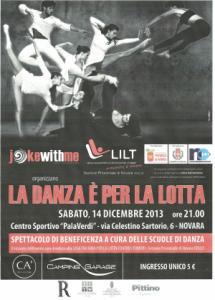 Novara - "Joke with me" comunicazione ed eventi di Mauro Paglia e L.I.L.T. Sezione Provinciale di Novara ONLUS, con il patrocinio della Provincia e del Comune di Novara, organizzano “La danza è per la lotta”; spettacolo di beneficenza a cura delle scuole di danza. Il ricavato dell’evento sarà devoluto alla Lega Italiana per la Lotta contro i Tumori - sezione provinciale di Novara Onlus. Appuntamento per sabato, 14 dicembre alle 21 presso il Centro Sportivo “PalaVerdi” - via Celestino Sartorio 6 a Novara. Ingresso unico: 5 euro.