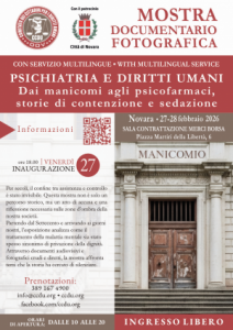 Novara - Dopo aver toccato le principali capitali mondiali e le maggiori città italiane, tra cui Roma, Torino e Milano, approda finalmente a Novara la mostra multimediale “Psichiatria e Diritti Umani: dai manicomi agli psicofarmaci, storie di contenzione e sedazione”, Patrocinata dalla Città di Novara e curata dal CCDU (Comitato dei Cittadini per i Diritti Umani odv). L'esposizione documenta attraverso rari filmati d'archivio e testimonianze la storia e le pratiche della psichiatria dalle origini ai giorni nostri.