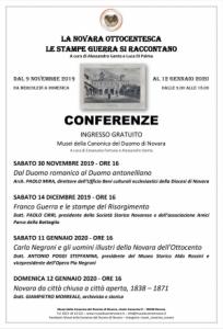 A presentare sia la collezione, sia alcune stampe esposte, sia il periodo storico sono chiamati alcuni studiosi novaresi: sabato 30 novembre alle ore 16 sarà l’Architetto Paolo Mira (direttore Ufficio Beni culturali ecclesiastici Diocesi di Novara) ad illustrare il passaggio “Dal Duomo romanico al Duomo antonelliano”, sabato 14 dicembre alle ore 16 interverrà il Dott. Paolo Cirri (Studioso di Storia, Presidente della Società Storica e presidente Amici Parco della Battaglia) che presenterà “Franco Guerra e le stampe del Risorgimento italiano”, sabato 11 gennaio 2020 sempre alle ore 16 il Dott. Antonio Poggi Steffanina (studioso di Storia e Numismatica, Vicepresidente Opera Pia Negroni e Presidente Museo Storico Aldo Rossini) racconterà di “Carlo Negroni e gli uomini illustri della Novara dell’Ottocento”, infine domenica 12 gennaio alle ore 16 il Dott. Giampietro Morreale (Storico e Archivista) chiuderà gli incontri culturali con “Novara da città chiusa a città aperta, 1838-1871”. Le conferenze sono ad ingresso gratuito e si terranno presso i Musei della Canonica in vicolo Canonica 9.