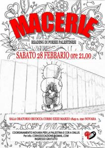Novara - Sabato 28 febbraio alle ore 21 nella sala oratorio della Bicocca a Novara, si terrà la prima della spettacolo “Macerie”. Nato come semplice reading di poesie, si è trasformato in un vero spettacolo con più forme artistiche. Le attrici e gli attori della Cor A Onlus, interpretano poesie dei più grandi poeti palestinesi: Mahmuod Darwish, Fadwa Tuqan, Samer Abu Hawwash e tanti altri. Le loro letture sono accompagnate da una video istallazione e dalla gentile partecipazione di Claudio De Pieri alla chitarra.