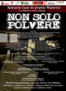 “Non solo polvere” è il titolo dello spettacolo che i ragazzi del Liceo Scientifico Antonelli, dell’Istituto Bonfantini e del Liceo Artistico Casorati porteranno in scena presso il Teatro Faraggiana il giorno 25 Gennaio alle ore 10:00 per gli studenti e il giorno 28 gennaio alle 21:00 per l’intera cittadinanza, in occasione della “Giornata della memoria”. Lo spettacolo nasce da un progetto sostenuto dal MIUR e dal titolo “Wonder-Box - la scatola dei ricordi” ed è stato coordinato dalla Fondazione Teatro Faraggiana, la regia è a cura di Elena Ferrari e il coordinamento drammaturgico ad opera di Silvana Bartoli, con la supervisione artistica di Vanni Vallino.