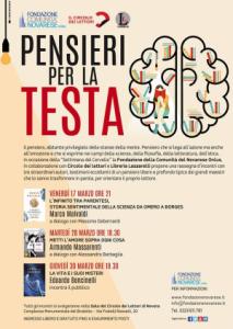 Novara - Tre luminari saranno protagonisti della rassegna "Pensieri per la testa" che la Fondazione Comunità Novarese Onlus propone per celebrare la "Settimana del Cervello 2017" in collaborazione con Libreria Lazzarelli e Circolo dei lettori di Novara. Venerdì 17 marzo, ore 21, “L’infinito tra parentesi”, storia sentimentale della scienza da Omero a Borges con Marco Malvaldi. A dialogo con Massimo Debernardi. Martedì 28 marzo, ore 18.30, “Metti l’amore sopra ogni cosa” con Armando Massarenti a dialogo con Alessandro Barbaglia. Giovedì 30 marzo, ore 18.30, “La vita e i suoi misteri”. Edoardo Boncinelli incontra il pubblico. Gli incontri si terranno nella sala del Circolo dei Lettori di Novara, via Fratelli Rosselli 20. Ingresso libero.