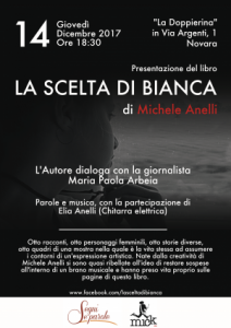 Novara - Giovedì 14 dicembre alle ore 18,30 nei locali della Doppierina, in Via Argenti 1 a Novara, si presenta “La scelta di Bianca”, il libro e il CD di Michele Anelli pubblicato da Segni e Parole. Nell’occasione l’autore, che converserà con la giornalista Maria Paola Arbeia, proporrà dal vivo alcuni brani del CD. Sono donne. Alcune hanno un nome, si chiamano Alice, Adele, Agnese, Bianca, Giulia o Marylin altre non ce l'hanno o non lo dicono perché parlano in prima persona. Sono partigiane, operaie, musiciste... ma soprattutto sono donne che affrontano i chiaroscuri e soprattutto gli spigoli della loro vita in prima persona. Prima di diventare racconti sono state canzoni. Otto racconti, otto personaggi femminili, otto storie diverse, otto quadri di una mostra nella quale è la vita stessa ad assumere i contorni di un'espressione artistica. Nate dalla creatività di Michele Anelli si sono quasi ribellate all'idea di restare sospese all'interno di un brano musicale e hanno preso vita proprio sulle pagine di questo libro. La suggestione della musica si fa parola in un miscela speciale che in fondo assomiglia alla vita perché, come dice Bianca, il senso dell'esistenza non è complicato ma racchiuso in poche, semplici cose: «Non necessariamente in quest’ordine, ma ascoltare musica, leggere, camminare e fare l’amore, se non quotidianamente, almeno spesso, bere anche un po’ di gustoso vino rosso...». Le canzoni da cui sono nate le storie, contenute nel CD allegato aiutano a immergersi completamente nel mondo delle protagoniste.