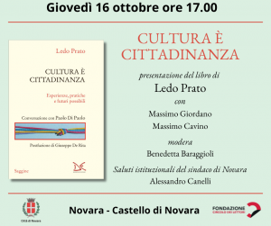Novara - Presentazione del libro Cultura è cittadinanza. Esperienze, pratiche e futuri possibili (Donzelli Editore) di Ledo Prato, che si terrà giovedì 16 ottobre alle ore 17, presso la Sala delle Mura del Castello di Novara. Introdurrà, Alessandro Canelli, Sindaco di Novara. Dialogano con l’autore il Prof. Massimo Cavino, Direttore del DISEI – Università del Piemonte Orientale e l'Avv. Massimo Giordano. Modera il dibattito la dott.ssa Benedetta Baraggioli. Il volume nasce dalla lunga esperienza di Ledo Prato nel campo delle politiche culturali e affronta temi cruciali come il rapporto tra cultura e politica, la lotta alla povertà educativa, la connessione tra impresa e attività culturali, con particolare attenzione ai contesti periferici e al Mezzogiorno.