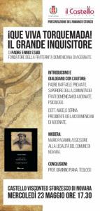 Novara - Presentazione pubblica del libro "Que Viva Torquemada. Il grande Inquisitore" di Padre Ennio Staid, fondatore della Fraternità Domenicana di Agognate. L'appuntamento è fissato per le 17.30 di mercoledì 23 maggio al Castello Sforzesco. Introducono e dialogano con l’autore: Padre Raffaele Previato, Superiore della Comunità dei Frati Domenicani di Agognate, Psicologo; Dott. Angelo Serina, Presidente dei Laici Domenicani di Agognate. Modera: Mario Paganini, Assessore alla legalità del Comune di Novara. Conclusioni: Prof. Giannino Piana, Teologo.