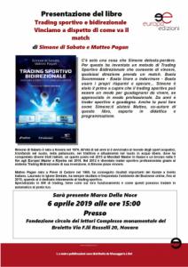 Novara - Presentazione del libro “Trading sportivo bidirezionale – Vinciamo a dispetto di come va il match” di Simone Di Sabato e Matteo Pagan; l'appuntamento si tiene sabato 6 aprile alle ore 15 presso la “Fondazione circolo dei lettori Complesso monumentale del Broletto” in via F. lli Rosselli 20 a Novara.