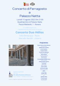 L’evento, organizzato con la collaborazione dell’Agenzia turistica locale Novarese, si terrà alle 21 nel quadriportico di palazzo Natta (piazza Matteotti, 1) e vedrà l’esibizione del “Duo Helios – Cappella musicale del Duomo di Novara” con i musicisti Sofia Bevilacqua (flauto) e Marcello Nardilli (chitarra), che proporranno un repertorio di melodie tradizionali e brani di Celso Machado, Ernesto Cordero, Michio Miyagi, Astor Piazzolla, Django Reinhardt, Zequinha de Abreu, Chick Corea, Ennio Morricone e Nicola Piovani.