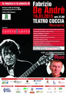 Novara - La musica e le parole di Fabrizio De Andrè saranno protagoniste venerdì 16 gennaio alle 21.00 al Teatro Coccia di Novara di un grande concerto organizzato per raccogliere fondi a sostegno di AISLA, l’Associazione Italiana Sclerosi Laterale Amiotrofica, da 31 anni impegnata a fianco dei malati di SLA e nel sostegno della ricerca scientifica su questa malattia. Alcune tra le più belle canzoni di De Andrè saranno eseguite dalla band “ControCanto” con la partecipazione del cantautore Ron. I biglietti sono disponibili al Teatro Coccia negli orari di apertura della biglietteria: da martedì a sabato, esclusi i festivi, dalle 10.30 alle 18.30, oppure il giorno stesso dello spettacolo, un’ora prima dell’inizio. Per i diversi settori di palchi e gallerie sono in vendita biglietti da 10, 12 e 15 €, per la platea da 20 €. I bambini sotto gli 8 anni pagano la metà. – biglietteria online: www.fondazioneteatrococcia.it