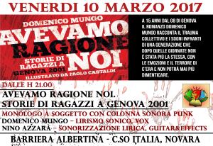 Novara - Spesso è stato detto che la memoria è un ingranaggio collettivo. Nel quindicennale di Genova 2001 ha sentito l’urgenza di raccontare quelle giornate attraverso un testo complesso, frammentato, con un ritmo sincopato, capace di creare atmosfere sospese, rarefatte, irreali, con la carica energetica di un pezzo punk/hardcore anni ’90, ma contemporaneamente poetico e simbolico, per affrontare un evento oramai storico e storicizzato a volte inenarrabile attraverso un percorso logico. Si passa così dalla dimensione reale, immortalata dai fotogrammi dei media ufficiali e alternativi dell’epoca, a un sentire più onirico, fatto di similitudini e assonanze che restituisce un diverso potere alle parole, ricollocandole nella giusta famiglia semantica da cui l’uso comune e la ripetizione vuota le ha strappate. La narrazione procede a ritroso, dall’incubo della Diaz e di Bolzaneto, per arrivare al prologo, la giornata di giovedì con la prima colorata e festosa manifestazione dei migranti, quando sembrava che la campagna mediatica precedente a quei giorni non avesse sortito nessun effetto. Sono tanti i volti che incontriamo, provengono da storie vere rimescolate tra loro e scandagliate dall’occhio attento di un autore che sin da quell’estate 2001 si è dedicato a raccontare e immortalare quei fatti. Il testo viene narrato attraverso un monologo accompagnato in un digrignare sferragliante di chitarra in distorsione e voce, alla maniera dell'epòs tragico a cui l'intero concept del soggetto fa riferimento. Io racconto storie che potrebbero essere ambientate in qualsiasi epoca della storia dell'umanità che ha visto l'esercizio abominevole del potere riversarsi con tracotante violenza sull'uomo libero, dall'antica Grecia dei Tragici alla Catalogna anarchica antifranchista e antistalinista del sanguinoso maggio del 1936, dai desaparecidos di Videla ai morti scannati da Bava Beccaris nella Milano umbertina, dai ragazzi striati di Reggio Emilia a Carlo Giuliani appunto.