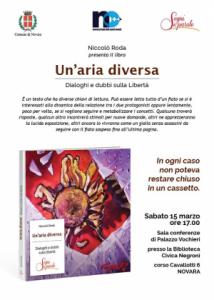 Novara - Sabato 15 marzo alla sala Conferenze di Palazzo Vochieri presso la Biblioteca Civica Negroni in corso Cavallotti 6 a Novara verrà presentato il volume “Un’aria diversa, - Dialoghi e dubbi sulla Libertà” di Niccolò Roda. La presentazione, che avrà inizio alle ore 17.00 è patrocinata dal Comune di Novara. L’autore usa una forma antica per sviluppare il suo pensiero. È quella del “dialogo” in cui le idee trovano la propria definizione attraverso un confronto progressivo. Il ragionamento si sviluppa attraverso il confronto verbale tra due o più persone e procede per passi successivi accompagnando con semplicità il lettore in un territorio arduo e talvolta ostico quale quello della ricerca filosofica e concettuale. Nato come forma espressiva di culture in cui l’oralità prevaleva sulla traccia scritta il dialogo è divenuto oggi, in una società apparentemente ricca di forme di comunicazione, uno strumento quasi rivoluzionario. È un testo che ha diverse chiavi di lettura. Può essere letto tutto d’un fiato se si è interessati alla dinamica della relazione tra i due protagonisti oppure lentamente, poco per volta, se si vogliono seguire e metabolizzare i concetti. Qualcuno troverà risposte, qualcun altro incontrerà stimoli per nuove domande, altri ne apprezzeranno la lucida esposizione, altri ancora lo vivranno come un giallo senza assassini da seguire con il fiato sospeso fino all’ultima pagina. Nessuno si accorge che è stato scritto da un giovane alla vigilia dell’esame di maturità. In ogni caso non poteva restare chiuso in un cassetto.