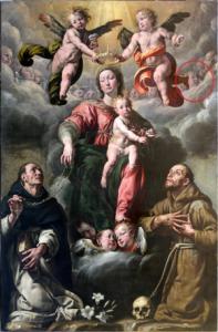Un po’ di storia: Antonio d’Enrico, detto Tanzio da Varallo, o semplicemente il Tanzio (Alagna Valsesia, 1575 circa – Varallo, 1633), è stato un pittore italiano tra i migliori interpreti di quel fervore di rinnovamento artistico che, in Piemonte e in Lombardia, si espresse, in modi diversi, sulla scia del lascito di spiritualità di San Carlo Borromeo e dell’Arte della Controriforma. Per molti decenni l’opera è stata conservata nell’area del presbiterio della parrocchiale, proprio sopra la porta della sacrestia da cui fu spostata solo per partecipare a importanti esposizioni: nel 1973 a Milano per “Seicento lombardo”, nel 1993 a Novara per una Mostra sul vescovo Bascapè e, nel 2000, ancora a Milano per la mostra “Tanzio da Varallo”. Dopo la mostra nella basilica di San Gaudenzio a Novara “Da Gaudenzio a Pianca” del 2009, il parroco don Osvaldo Migliavacca ha fatto riposizionare la tela nel luogo originale: sopra l’altare della cappella del Rosario, situato alla sinistra prima dell’altar maggiore. La datazione riguardante il luogo originario del posizionamento del quadro nella citata cappella non è certa. Negli atti della visita pastorale del 1639 si dice solo che nell’altare vi è un’icona non meglio specificata mentre negli atti del 1662 si indica che la cappella laterale è adornata da una “icona” della Madonna del Rosario in una “ancona di stucco” e in una nicchia laterale una statua della B.V. del Rosario (quella poi trasformata in una Madonna del Carmine e ancora esistente). Il vescovo Visconti nel 1697 definisce l’icona “elegantissime picta” e anche il Balbis Bertone la trova apprezzabile nella sua visita del 1760. Nel testo a commento della mostra del 2009 la commissione della tela viene attribuita alla Confraternita del SS. Sacramento, ma se veramente la tela è giunta a Lumellogno nel 1627, la committenza è più probabilmente da attribuirsi alla Confraternita del Rosario, allora esistente in Lumellogno, che aveva il patrocinio su quell’altare. Uno studio a “monocromo” per i due angeli nella parte alta dell’altare è conservato nella Pinacoteca di Varallo Sesia. Tra le memorie del curato De Paulis è conservata una lettera, con una nota a commento, riguardo al quadro della Madonna del Rosario conservato nella Chiesa parrocchiale.