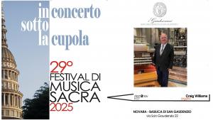Novara - Craig S. Williams all’organo Mascioni della basilica di San Gaudenzio per la XXIX stagione del Festival di Musica Sacra “in Concerto sotto la cupola”. Appuntamento in basilica domenica 2 novembre alle ore 17. Ingresso libero. Il quinto appuntamento della XXIX edizione del festival di Musica Sacra vedrà alla consolle del monumentale organo Mascioni l’organista statunitense Craig S. Williams, titolare dell’organo a canne da chiesa più grande del mondo. Craig Williams, che è già stato apprezzatissimo ospite del festival nel 2023, proporrà uno straordinario programma che spazia dalla musica di Bach a Mendelssohn a Liszt, offrendo anche l’opportunità ascoltare ed apprezzare brani di compositori contemporanei. . La rassegna si concluderà il 9 novembre.