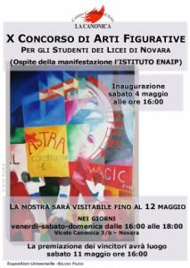 Novara - Sabato 4 maggio il Centro Culturale La Canonica inaugurerà la decima edizione del Concorso di Arti Figurative riservato agli studenti dei Licei di Novara. "In 10 anni - spiegano Rossella Lombardi e Maria Teresa Amore, presidente e segretaria del centro culturale - il progetto ha coinvolto circa 1.000 studenti del territorio, premiandone il talento e offrendo a tutti la possibilità di confrontarsi con gli artisti che gravitano attorno alla nostra realtà, in un dialogo particolarmente costruttivo e proficuo per tutti". Alla manifestazione partecipano gli allievi novaresi dei Licei Scientifici Antonelli e San Lorenzo (Salesiani), e dei Licei Artistici Casorati e Modigliani. Ospiti dell'evento gli studenti dell'ENAIP. Due le sezioni nelle quali è diviso il premio: una a tema libero e un'altra dedicata all'inquinamento del pianeta. Da sabato saranno in mostra circa 80 lavori che gli studenti hanno realizzato in classe con i loro docenti. L'evento sarà visitabile fino a domenica 12 Maggio nei giorni di venerdì, sabato e domenica dalle 16 alle 18. La premiazione degli studenti finalisti avrà luogo sabato 11 Maggio, alle ore 16.