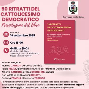 Galliate - Martedì 16 settembre, presso la Sala stucchi della Biblioteca di Galliate, alle ore 18, avrà luogo la presentazione del volume “50 ritratti del cattolicesimo democratico”. Ospiti della serata Monica Canalis, curatrice del volume, Fabio Pizzul, giornalista, il Sindaco di Galliate, Alberto Cantone e il Sindaco di Bellinzago Novarese, Fabio Sponghini. Nel corso dell’incontro verranno letti dei brani del volume da parte di Giovanni Ceriotti, Giuliana Pomella e Benedetta Todesco.