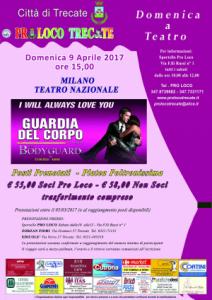 Trecate - La Pro Loco Trecate informa che sono aperte le iscrizioni per assistere al Musical “Bodyguard” il 9 aprile al Teatro Nazionale di Milano. E’ possibile iscriversi presso: Zorzan Fiori via Gramsci 57, Edicolè via Verra 27, Sportello Pro Loco via F.lli Russi 1 tutti i sabato mattina dalle 10 alle 12. Il costo è di € 58,00 per i non soci e di € 55,00 per i soci Pro Loco Trecate, ricordiamo che iscrivendosi o rinnovando il tesseramento alla Pro Loco si ha diritto ad un buono sconto del 5% offerto dal Carrefour di corso Roma di Trecate, oltre a tutte le altre convenzioni riportate all’interno del terzo libretto della guida turistica sintetica. Per ulteriori informazioni visitare la pagina web www.prolocotrecate.it.