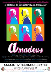 Cerano - "Il 17 febbraio - afferma l'assessore alla Cultura del Comune di Cerano, Tommaso Vitarelli - la stagione di prosa della Sala Crespi propone "Amadeus", realizzata dalla Compagnia Teatrale della Civetta su testo di Peter Shaffer (dal quale è stato anche tratto l'omonimo film di Milos Forman vincitore di 8 premi Oscar). Nella Vienna del 1823, un ormai vecchio Antonio Salieri mette in scena il suo racconto degli anni che lo videro protagonista alla corte di Giuseppe II insieme al prodigio Wolfgang Amadeus Mozart. Sul palco è dipinta anche la parabola discendente del giovane compositore, dall'oro del palazzo imperiale alla polvere del suo appartamento, passando dai teatri di corte profumati ed eleganti a quelli di periferia, con il tipico odore di birra, sudore e salsicce. Ingresso euro 10,00. Vendita biglietti presso la biblioteca comunale, circuito ciaotickets, online ed in Sala Crespi da un'ora prima dello spettacolo”.