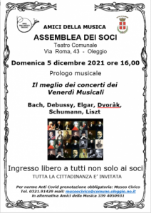 Oleggio - Il meglio dei programmi dei concerti dell’anno che sta per chiudersi verrà ripreso domenica 5 dicembre 2021 con inizio alle ore 16 presso la sala grande del Teatro comunale di Oleggio - in via Roma 43, ampio parcheggio gratuito di fianco al teatro - in occasione dell’Assemblea dei Soci degli Amici della Musica. Come è ormai tradizione consolidata, lo svolgimento dell’Assemblea sarà preceduto da un “prologo musicale” con registrazioni storiche audio/video dei brani che sono stati eseguiti nei concerti dei “Venerdì Musicali”, con sintetiche ed essenziali note di guida all’ascolto. Si potranno così ascoltare i capolavori di J.S.Bach, Debussy, Elgar, Liszt e Schumann che fanno parte non solo della storia della musica, in particolare di quella del secolo d’oro - il XIX - della musica romantica, ma anche dell’interpretazione musicale (con una piacevole sorpresa). Anche coloro che non sono soci del sodalizio oleggese - giunto ormai al 55° anno di vita - saranno i benvenuti, così come sono cordialmente invitati tutti coloro che apprezzano la “buona” musica di qualunque genere essa sia. Da segnalare che tra i brani sopraindicati vi è anche la famosa e non facile da ascoltare nelle sale da concerto “Ciaccona in re minore” di Bach nella trascrizione di Ferruccio Busoni, che ogni volta che la si ascolta lascia stupefatti ed emozionati anche coloro che non si ritengono “intenditori”: per chi non la ha mai potuta ascoltare questa può essere l’occasione giusta. L’ingresso è libero. Per la prenotazione: Museo Civico tel. 0321 91429; Amici della Musica cell. 339 4050931