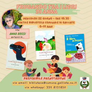 Galliate - Mercoledì 22 giugno, ore 16,30, cortile della biblioteca - Bambini 6-11 anni - "Frugando tra i libri di Anna" - Anna Bossi presenta e anima le sue tre ultime pubblicazioni: "Il libro dei tesori", "Ajeneide" e "la follia di Leon". Gli ultimi due titoli citati intendono attualizzare i temi della letteratura classica e scoprire come essi non tramontino, ma facciano sempre parte del nostro tempo nonostante il trascorrere del tempo.