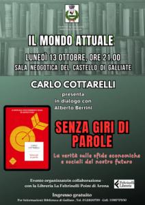 Galliate - Lunedì 13 ottobre alle ore 21 presso la Sala Neogotica del Castello di Galliate, avrà luogo un nuovo incontro del ciclo “Il mondo attuale” che l’Amministrazione comunale propone per approfondire le complesse tematiche della realtà nazionale e internazionale. Ospite della serata, realizzata in collaborazione con la Libreria La Feltrinelli Point di Arona, Carlo Cottarelli che, in dialogo con Alberto Berrini, presenterà il volume di recente pubblicazione Senza giri di parole. La verità sulle sfide economiche e sociali del nostro futuro, edito nel 2025 da Mondadori.