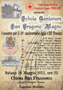 Trecate - Sabato 28 maggio alle ore 21 si svolgerà un concerto dell'acclamata Schola Cantorum "San Gregorio Magno" nella suggestiva cornice della Chiesa San Francesco di Trecate. L'occasione è quella di festeggiare il 30° anniversario di fondazione del Comitato Locale di Croce Rossa e sarà presentato un repertorio di prim'ordine (canti tratti da opere di Bach, Mozart, Verdi e altri ancora), il tutto con ingresso gratuito. A questa iniziativa ne faranno seguito altre, anche dislocate sul territorio di Cerano e Sozzago, sempre inserite nel ricco calendario di eventi per celebrare i primi trent'anni della CRI Trecate.