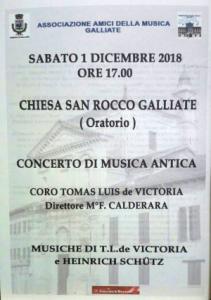 Galliate - Sabato 1° dicembre alle ore 17 presso la chiesa di San Rocco di Galliate (attigua all'oratorio in via Varallino) si tiene un concerto di musica antica con il coro Tomas Luis de Victoria; dirige il maestro F. Calderara. In programma musiche di T.L. De Victoria e Heinrich Schutz. Gli amici della musica consigliano gli appassionati "di ogni genere di musica di non perdere quest'occasione. Il valore aggiunto sarà rappresentato dalla particolare acustica della chiesa che con il suo naturale riverbero renderà particolarmente suggestive le sonorità del coro".