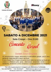 Cerano - Sabato 4 dicembre alle ore 21 in Sala Crespi si terrà il concerto Gospel del coro Sweet Soul Singers. Un emozionante viaggio attraverso le atmosfere gospel, pop e soul, partendo dagli standard negro-spiritual. Il coro Sweet Soul Singers propone brani dalle tematiche spirituali per vivere e riflettere sulla gioia, alternando ensemble corale a voci solistiche, rendendo lo show dinamico e continuamente sorprendente. Per info e prenotazioni rivolgersi alla Biblioteca Comunale: Tel. 0321 726704 - Cell. 334 1052271; email: biblioteca@comune.cerano.no.it. Ingresso gratuito, green-pass obbligatorio.