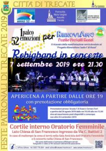 Le musiche di George Gershwin, Neal Hefti, Gorni Kramer, Giancarlo Gazzani, Renato Carosone, Glenn Miller, Stewie Wonder, Cole Porter allieteranno il pubblico in una atmosfera magica. Il concerto infatti si svolgerà nel cortile interno dell’Oratorio Femminile prospicente la chiesa di San Francesco, in una scenografia incantata fra luci e paillettes. Nella circostanza si propone grazie alla collaborazione del Comitato Genitori della Scuola F.lli Russi un’apericena per la raccolta fondi con il progetto “RinnoviAmo l’Asilo F.lli Russi” che da tempo si propone di sollecitare la popolazione trecatese al prossimo e improrogabile rinnovamento di alcune parti dell’edificio scolastico. A tal fine vi aspettiamo numerosi alle ore 19 di sabato 7 settembre all’oratorio femminile per degustare in compagnia di famigliari e amici una gustosa apericena previa prenotazione presso la Scuola Materna F.lli Russi e Zorzan Fiori a partire dal 26 agosto e sino ad esaurimento posti. Al termine e a partire dalle ore 21,30 con ingresso libero per tutti, senza necessità di prenotazione, si potrà apprezzare un esilarante mix di straordinarie melodie musicali con la RobigBand.