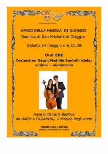 E’ la prima volta che un “Duo” violino/violoncello debutta nella Basilica del Cimitero di Oleggio e il fascino e l’emozione degli strumenti ad arco all’interno di un monumento così importante, come detto risalente all’anno mille, e forse anche prima, con gli affreschi del XIII secolo, fa di questa serata un evento per la Città di Oleggio possibilmente da non perdere. Davanti alla Basilica vi sono ampi parcheggi liberi. Non occorre prenotazione.