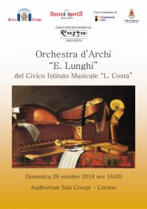 Cerano - Domenica 28 ottobre alle ore 16 è in programma un concerto orchestra d'archi 'E. Lunghi'. L'ensamble del C.I.M. “L.Costa” torna in concerto nella Sala Crespi a Cerano. Sarà un'occasione speciale, in quanto il 2018 è un anno dal valore fortemente simbolico per la compagine vigevanese: ricorrono infatti il 50° anniversario della fondazione dell'Orchestra d'Archi e il 140° dalla nascita del Civico Istituto Musicale “L. Costa”. Il programma prevede musiche di J.B. Lully, G.P. Telemann, G.A. Brescianello, L. Boccherini e A. Corelli. Il repertorio punta lo sguardo sulla musica pensata per la corte di Luigi XIV e composta da G.B. Lulli, si sposta poi sulle briose invenzioni di G.P. Telemann, per proseguire con le opere di G.A. Brescianello, L. Boccherini e A. Corelli.