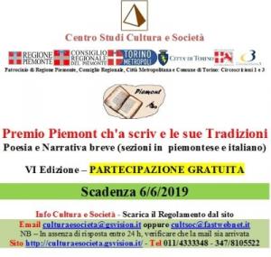 Trecate - Il Centro Studi Cultura e Società di Torino ha indetto il premio di poesia e narrativa breve “Piemont ch’a scriv e le sue Tradizioni” giunto alla sesta edizione che intende promuovere e valorizzare la lingua piemontese e far conoscere la cultura popolare e le tradizioni della nostra Regione. Entro il 6 giugno le opere a tema libero in lingua piemontese e sulle tradizioni del Piemonte in lingua italiana dovranno pervenire al Centro Studi Cultura e Società o via e-mail all’indirizzo cultsoc@fastwebnet.it (in formato word con le opere e i dati dell’Autore) o con spedizione postale all’indirizzo via Cesana 56 - 10139 Torino (ogni opera deve essere inviata in sei copie di cui una con i dati dell’autore). Le sezioni sono tre: poesia in lingua piemontese a tema libero, narrativa in lingua piemontese a tema libero e poesia in lingua italiana a tema “cultura popolare e tradizioni piemontesi”. La partecipazione è gratuita ed è possibile partecipare a più sezioni con una sola opera per sezione anche con scritti già pubblicati (in questo caso indicare il titolo del volume o della rivista su cui il brano è stato edito).
