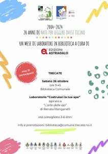 Trecate - Nell’ambito dei “20 anni di Nati per leggere Ovest Ticino”, il sistema bibliotecario Bant organizza l’iniziativa “Un mese di laboratori in biblioteca a cura di Edizioni Astragalo”. Alla Biblioteca civica di Trecate l’appuntamento, riservato ai bambini dai 3 ai 6 anni, è alle 9.45 del prossimo 26 ottobre con “Costruisci la tua ape” ispirato a “L’arte delle api” di Renata Manganelli. L’iniziativa è aperta a un massimo di quindici partecipanti. Per informazioni è possibile scrivere una mail all’indirizzo biblioteca@comune.trecate.no.it.