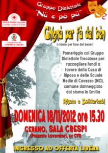 Cerano - Domenica 18 novembre il Gruppo Dialettale "Nü e pö pü", reduce dal successo di pubblico ottenuto con lo spettacolo tenuto durante la "Notte Nera", e la Croce Rossa Italiana Comitato di Trecate, tornano a collaborare con scopo solidale. La collaborazione si sposta in trasferta: i divertenti sketch in dialetto trecatese, scritti da Silvia Colla e interpretati dal simpatico gruppo, troveranno spazio sul palco della Sala Crespi di Cerano. Con l'ingresso ad offerta libera, si persegue l'intento di raccogliere fondi da destinare al comune di Cavezzo (Modena), comune seriamente danneggiato dal sisma del maggio scorso in Emilia. Le offerte raccolte, nello specifico, andranno a sommarsi a quelle derivate da altre manifestazioni analoghe organizzate dalla CRI Trecate nei mesi passati (intermediazione alla vendita di Parmigiano Reggiano proveniente da caseifici colpiti dal terremoto, vendita torte in piazza, raccolte di materiale da inviare ai terremotati, ecc) e serviranno a sostenere dei progetti molto importanti: parte del ricavato servirà ad acquistare attrezzature per la locale Casa di Riposo e il resto confluirà in un conto aperto per poter mettere in sicurezza l'edificio che ospita le scuole medie.