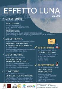 “Effetto Luna” dedica due appuntamenti anche ai più piccoli, entrambi in Biblioteca: sabato 23 settembre alle ore 10 le volontarie di NPL – Nati Per Leggere intratterranno i bambini nella fascia d’età 2-6 anni con “Letture lunatiche”, a ingresso libero, mentre giovedì 28 settembre alle 16,30 si terrà il laboratorio stellare a cura di Gloria Carraro “Gocce di latte nella galassia”, per la fascia 7-10 anni (prenotazione: e-mail biblioteca@comune.cameri.no.it, cell. 3312311264).
