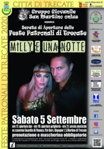 · “Serata Musicale con Milly e una Notte” Sabato 5 Settembre 2020. Il Gruppo Giovanile San Martino onlus, con il Patrocinio della Città di Trecate, organizza la Serata di Apertura delle Feste Patronali di Trecate presso la ex caserma della Guardia di Finanza, Piazzale Bersagliere Bigogno 1, San Martino di Trecate.