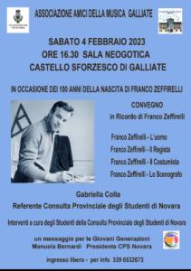 Galliate - Importante appuntamento dedicato un artista, che è stato un'autentica colonna portante del cinema e del teatro (prosa e opera) del Novecento: Franco Zeffirelli. In occasione del centesimo anniversario della sua nascita, gli Amici della Musica con il patrocinio del Comune di Galliate organizzano un convegno che avrà luogo alle ore 16,30 di sabato 4 febbraio all'interno della Sala Neogotica presso il Castello Visconteo Sforzesco di Galliate. Titolo dell'incontro sarà: 'Zeffirelli, l'uomo, il regista, il costumista e lo scenografo'. Collabora al progetto anche Gabriella Colla, referente Consulta provinciale degli Studenti di Novara; previsti anche vari interventi e un messaggio per le giovani generazioni di Manuela Bernardi, presidente Cps Novara. Per ulteriori informazioni telefonare al 339 6532673.