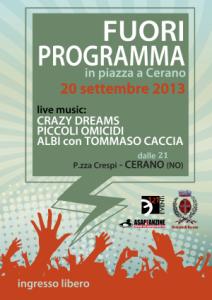 Cerano - Appuntamento a Cerano per venerdì 20 settembre a partire dalle ore 21. "Fuori programma" è una manifestazione musicale in cui si esibiranno Crazy Dreams, giovanissima e talentuosa band locale, il dj Albi Scotti con Tommaso Caccia, e i Piccoli Omicidi, che ci proporranno un'anteprima musicale della manifestazione Il Sabato di Provincia Cronica, che si terrà invece il 28 settembre prossimo. La band modenese dei Piccoli Omicidi, attiva dal 2005, ha esordito live sul palco di Luciano Ligabue al Campovolo di Reggio Emilia, esibizione che ha avvicinato la band a Paolo Benvegnù che, impressionato dalla loro musica, decide di produrre l’album e consente loro di aprire i concerti di importanti artisti italiani quali Verdena, Modena City Ramblers e lo stesso Benvegnù.